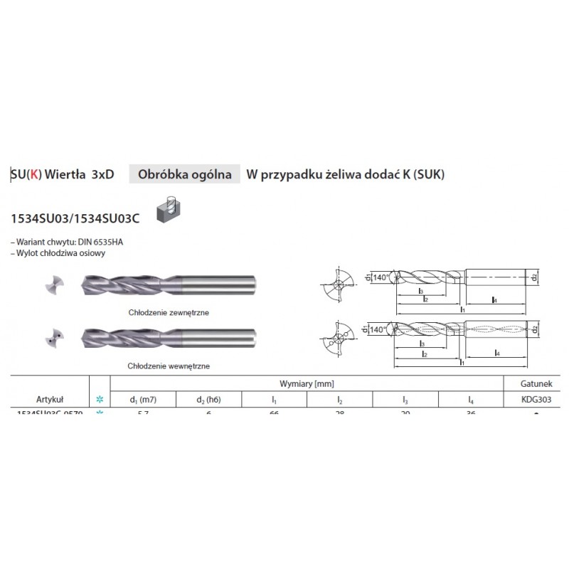 Wiertło VHM 3xD seria 1534su z chłodzeniem wewnętrznym fi 3,0